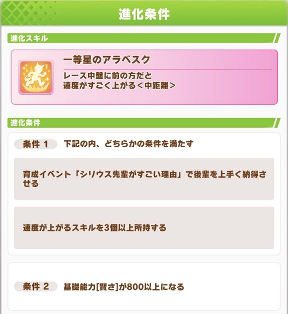 進化条件:条件1<育成イベント「シリウス先輩がすごい理由」で荒廃をうまく納得させる>または<速度が上がるスキルを3個以上所持する>・条件2<基礎能力[賢さ]が800以上になる>
