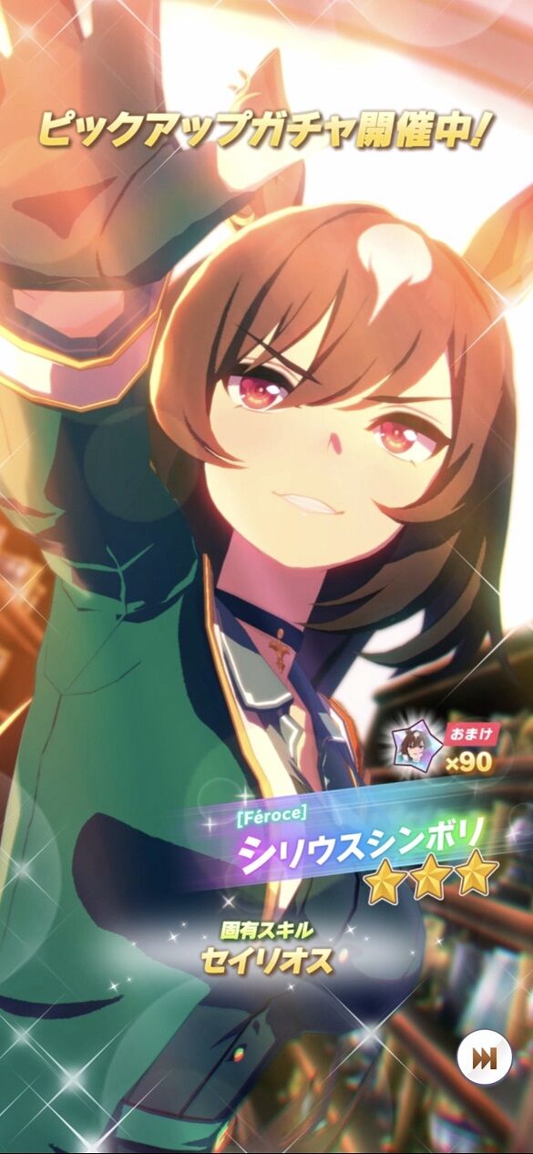 海外制覇を目指す強気で自信家なウマ娘シリウスシンボリの実装を待っていた方、史実のシリウスシンボリが好きな方、中距離2400mに特化した性能のキャラが欲しい方は是非狙ってみてはいかがでしょうか!