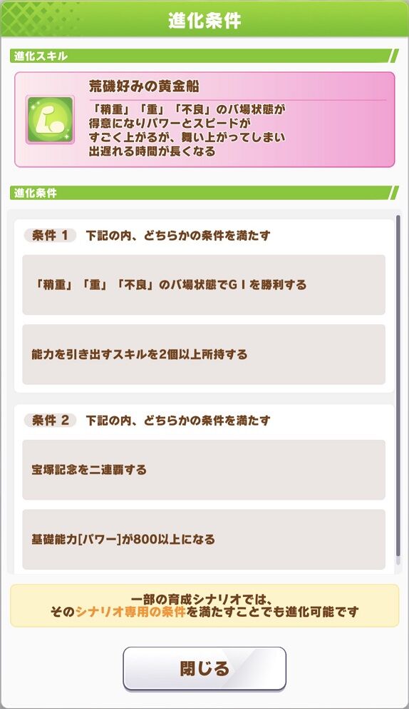 進化条件:条件1<「稍重」「重」「不良」のバ場状態でGⅠを勝利する>または<能力を引き出すスキルを2個以上所持する>・条件2<宝塚記念を二連覇する>・条件3<基礎能力[パワー]が800以上になる>