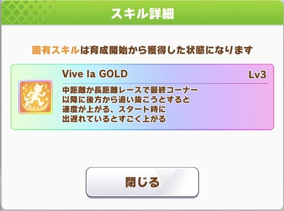 中距離か長距離レースで最終コーナー以降に後方から追い抜こうとすると速度が上がる、スタート時に出遅れているとすごく上がるスキルです!