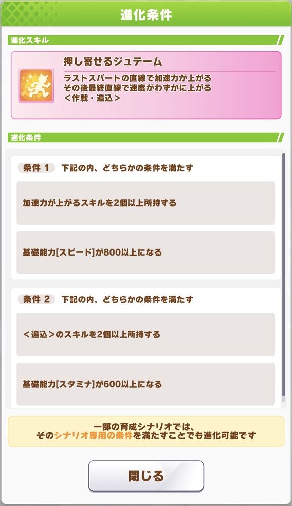 進化条件:条件1<加速力が上がるスキルを2個以上所持する>または<基礎能力[スピード]が800以上になる>・条件2<追込のスキルを2個以上所持する>または<基礎能力[スタミナ]が600以上になる>