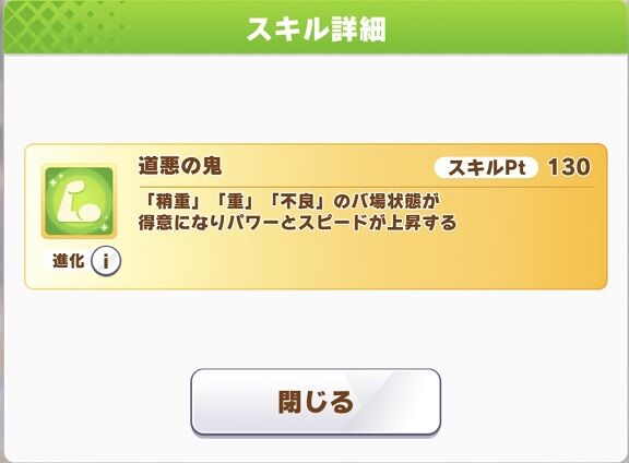「稍重」「重」「不良」のバ場状態が得意いなりパワーとスピードが上昇するスキルです!