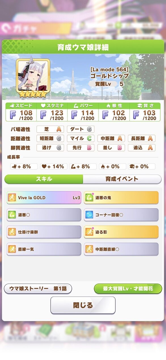 覚醒レベルを上げることで道悪〇の上位スキル『道悪の鬼』・直線一気の上位スキル『迫る影』・『仕掛け抜群』・『中距離直線〇』を持っています!