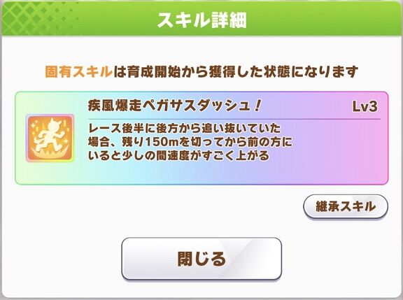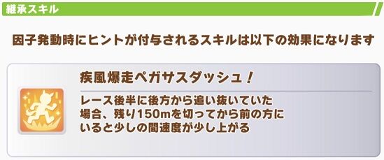 レース後半に後方から追い抜いていた場合、残り150mを切ってから前の方にいると少しの間速度がすごく上がるスキルです!(☆2では速度が上がるとなっています)