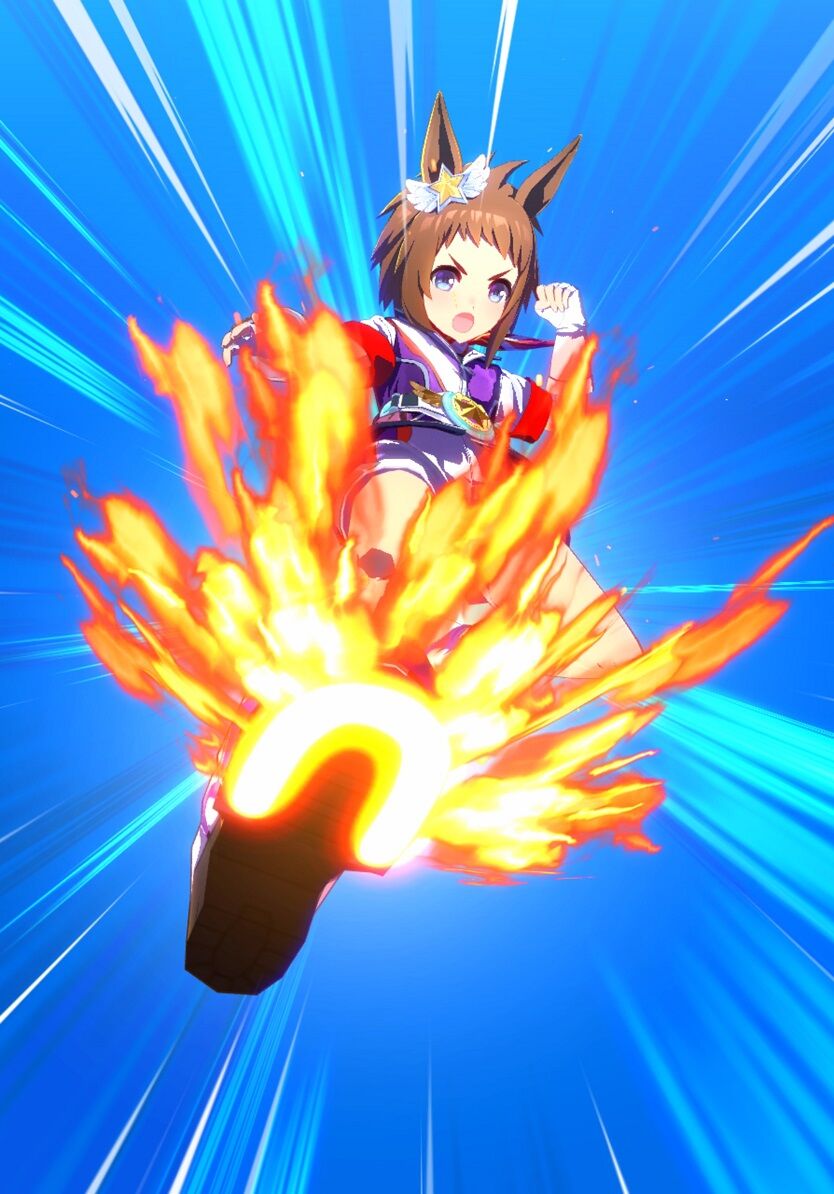 中盤終盤力の強い構成で進化スキル『必殺・電撃キーック!』で終盤加速もしっかり持っており、固有スキル『疾風爆走ペガサスダッシュ!』は残り150m発動の速度スキルで発動タイミングが良く効果量も多くて優秀!短距離キャラの中でも所持スキルや固有スキルが汎用的で使いやすく競技場の短距離枠としても使えるキャラですね!