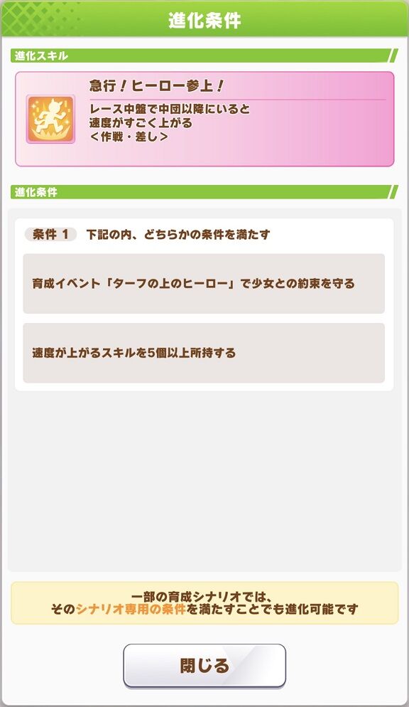 進化条件:条件1<育成イベント「ターフの上のヒーロー」で少女との約束を守る>または<速度が上がるスキルを5個以上所持する>