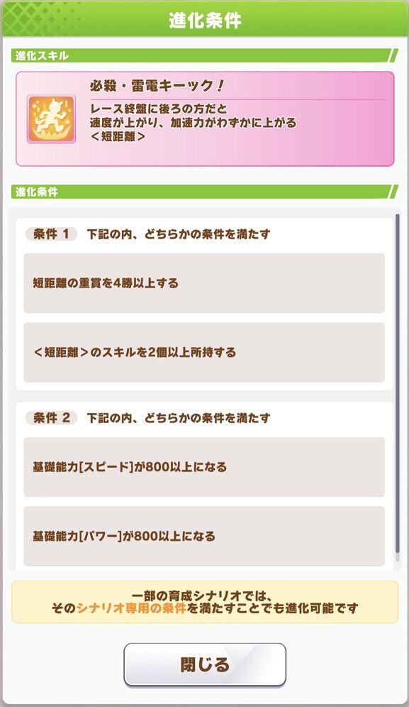 進化条件:条件1<短距離の重賞を4勝以上する>または<短距離のスキルを2個以上所持する>・条件2<基礎能力[スピード]が800以上になる>または<基礎能力[パワー]が800以上になる>