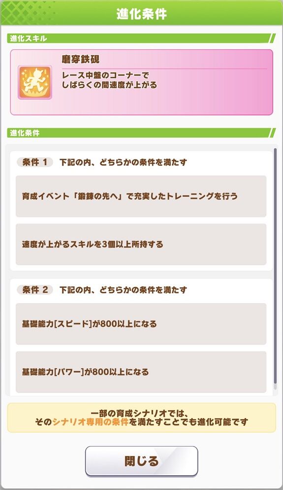 進化条件:条件1<育成イベント「鍛錬の先へ」で充実したトレーニングを行う>または<速度が上がるスキルを3個以上所持する>・条件2<基礎能力[スピード]が800以上になる>または<基礎能力[パワー]が800以上になる>