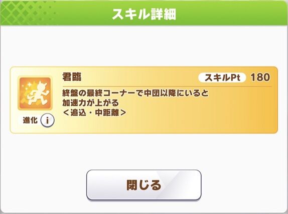 終盤の最終コーナーで中団以降にいると加速力が上がる追込・中距離スキルです!