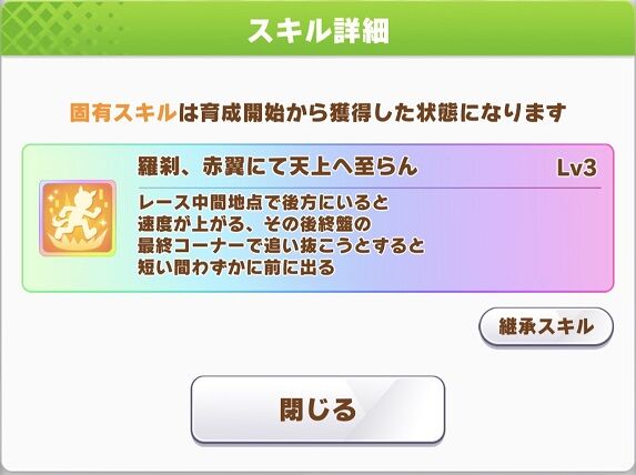 継承では追加の現在速度はおまけ程度になってしまいますが後方脚質用中盤速度としては白スキルほどであるためスキルレベルが上がっていればとっても良いですね