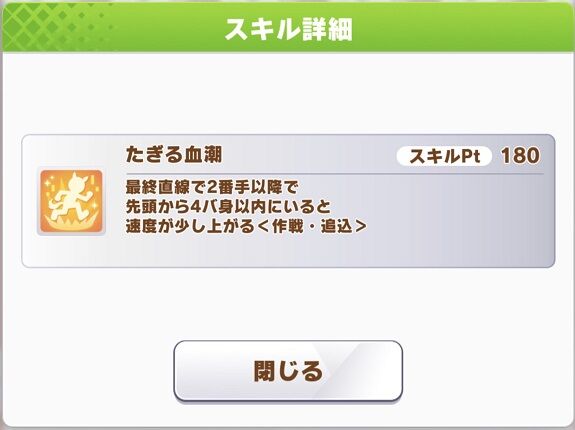 最終直線で2番手以降で先頭から4バ身以内にいると速度が少し上がる追込スキルです!