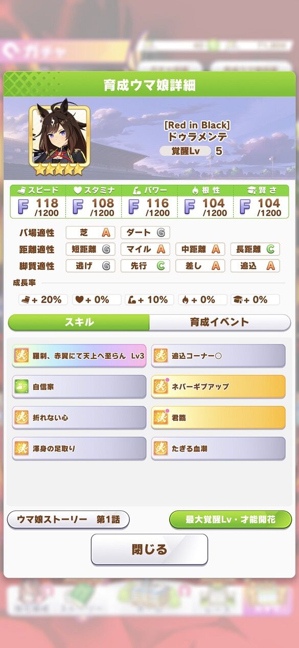 今回は2月24日(土)の更新で育成キャラに実装された☆3ドゥラメンテについて、さっそく性能についての感想を書いていこうと思います!
