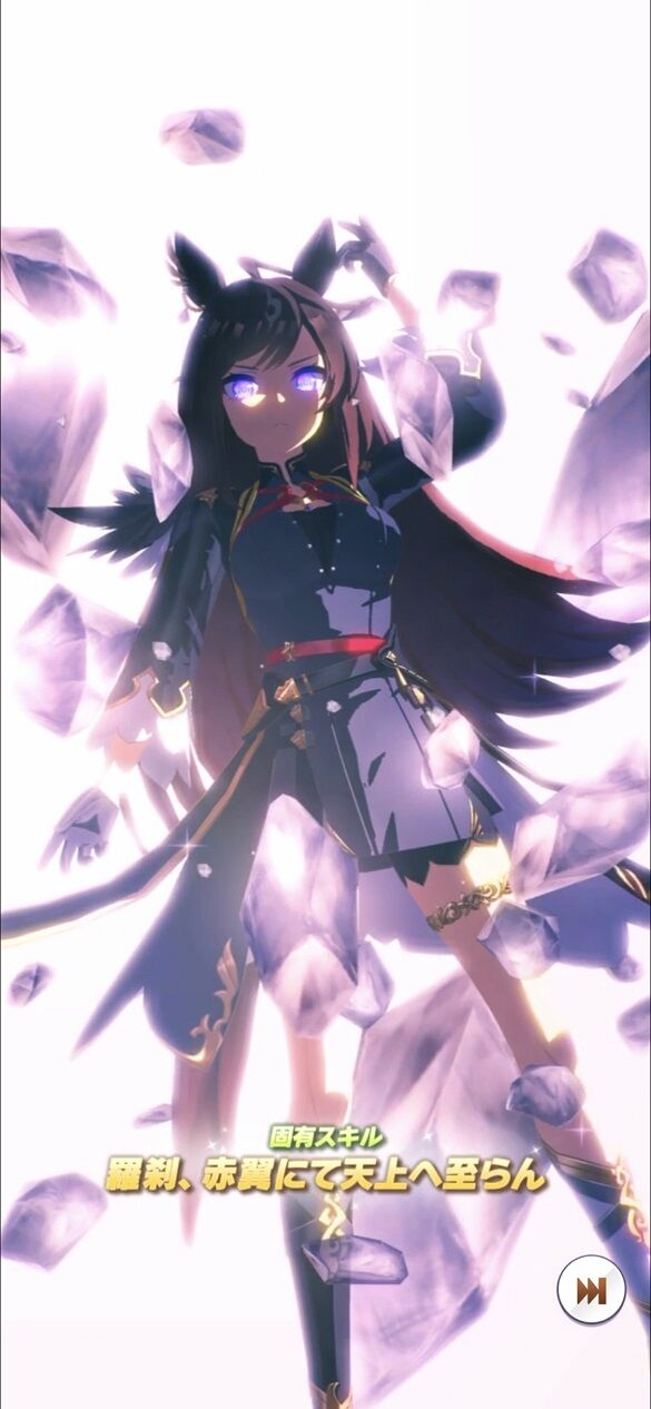 『君臨』の進化スキル『赫焉』が終盤の最終コーナーまたは中山レース場の終盤で発動する加速スキルで皐月賞と日本ダービー条件、また凱旋門賞での条件でも非常に強力な加速スキルで追加で最終直線速度も発動する強力なスキルとなってます!